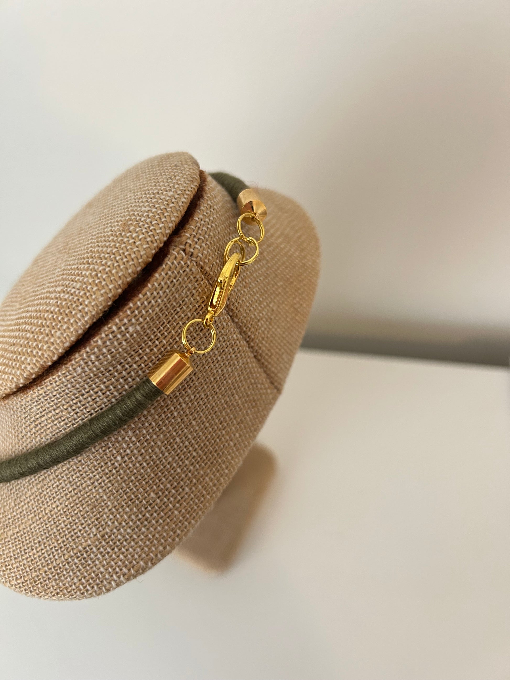 30" nylon cording wrapped yarn * the knot is ~1.25" wide and hand-tacked in place * necklace measures ~6.26" from closure to the top of the knot. The longest tail measures ~4" from the bottom of the knot to the tip. * raw brass tips and end caps * gold-plated lobster clasp + jump rings, including 1/2" extender rings