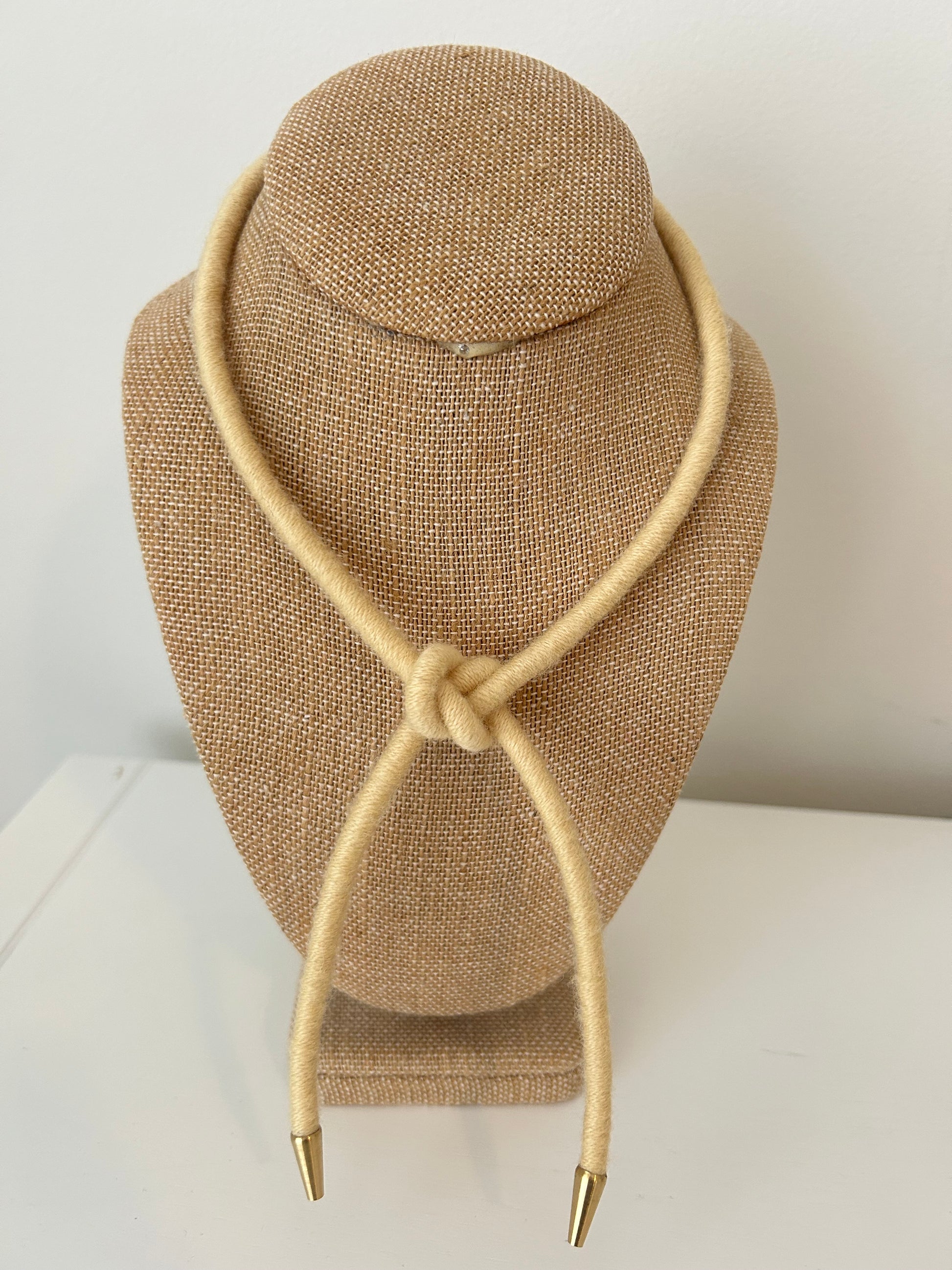 30" nylon cording wrapped yarn * the knot is ~1.25" wide and hand-tacked in place * necklace measures ~6.26" from closure to the top of the knot. The longest tail measures ~4" from the bottom of the knot to the tip. * raw brass tips and end caps * gold-plated lobster clasp + jump rings, including 1/2" extender rings